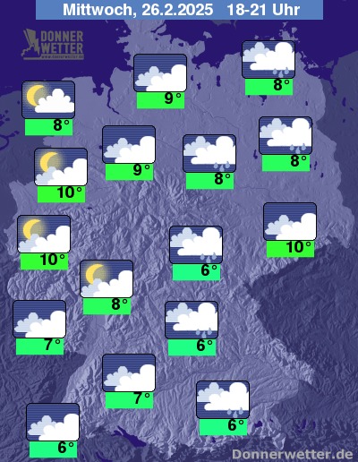 Heute Abend ist es über großen Teilen Deutschlands dicht bewölkt, vor allem im Westen und Nordwesten zeigen sich aber auch oft Auflockerungen, hier bleibt es meist trocken. Im übrigen Land, vor allem über der Osthälfte fällt aber gebietsweise Regen. Die Temperatur liegt bei 6 Grad in Mittelfranken und bis 10 Grad im Rheinland.