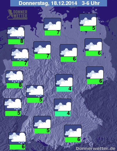 In der Nacht zum Donnerstag halten sich meist dichte Wolken, dazu fällt meist nur noch gelegentlich Regen, oft bleibt es auch schon trocken. Im Westen kommen jedoch erneut dunkle Wolken auf, die für teils langanhaltenden Regen sorgen. Die Temperatur sinkt auf 8 Grad in Emmerich und etwa 4 Grad in Niederbayern.