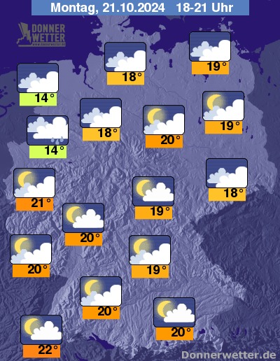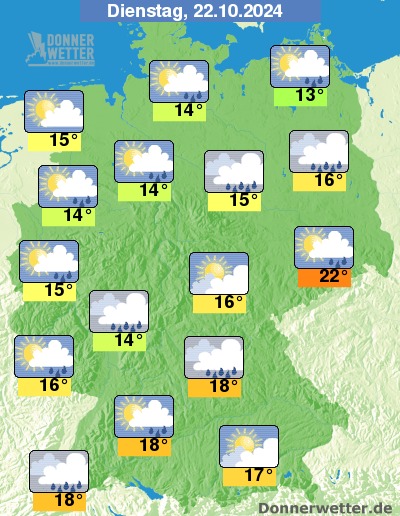 In der Nacht zum Dienstag breitet sich der Regen auch auf den Norden und Westen Deutschlands aus. Vor allem über Sachsen und dem Süden zeigt sich der Himmel meist sternenklar, in den übrigen Landesteilen ist es wechselnd bis stark bewölkt und weitgehend trocken. Die Temperatur sinkt auf 15 Grad in Freiburg und bis 10 Grad im Emden.
