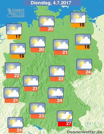 Am Dienstag ist das Wetter häufig heiter oder sonnig, hier und da ziehen allerdings auch mehr und teils dichte Wolken auf. Von Bayern bis nach Sachsen sind dazu auch einzelne Schauer, selten auch Gewitter möglich, im übrigen Land bleibt es jedoch trocken. Die Temperatur steigt auf 17 Grad an der Nordsee und bis 27 Grad in München.