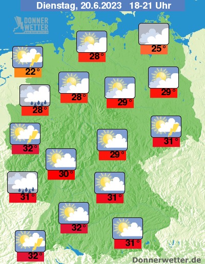 Heute Abend nimmt die Bewölkung vor allem nach Westen hin noch weiter zu und hier kommen im Verlauf teils kräftige Schauer und Gewitter auf. Weiter nach Osten hin ist es auch häufig heiter und es bilden sich nur selten Schauer und Gewitter. Die Temperatur liegt bei 22 Grad an der Nordsee und 32 Grad in Schwaben.