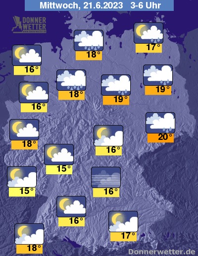 In der Nacht zum Mittwoch zieht eine Gewitterfront einmal von West nach Ost durch, davor und dahinter ist der Himmel oft nur locker oder aufgelockert bewölkt. In der Front sind zum Teil kräftige Schauer und Gewitter möglich. Gegen Morgen ist es dann auch im Osten und Nordosten weitgehend trocken. Die Temperatur sinkt auf tropische 20 Grad in Dresden und bis 15 Grad in Saarbrücken.