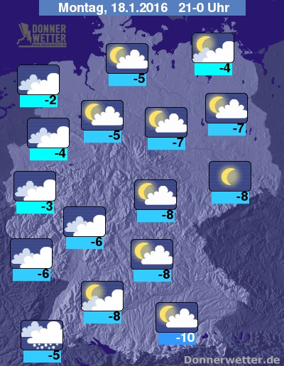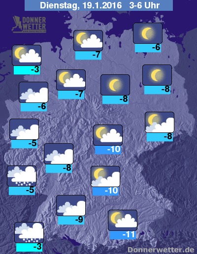 In der Nacht zum Dienstag halten sich vom Westen bis in den Südwesten Deutschlands weitgehend dichte Wolken, dabei ist im Südwesten auch gebietsweise Schneefall möglich, dazu besteht erhöhte Glättegefahr, sonst bleibt es weitgehend trocken. Im Norden und Osten zeigt sich der Himmel oft sternenklar und dazu bleibt es trocken. In den übrigen Landesteilen ist es überwiegend aufgelockert bewölkt und trocken. Die Temperatur sinkt auf -3 Grad an der Nordseeküste und bis -11 Grad im Raum München.