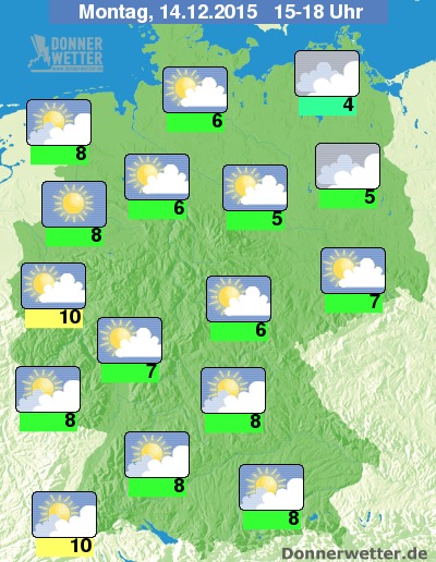 Heute Nachmittag bleiben die Wolken vor allem im Nordosten Deutschlands häufig dicht, sonst gibt es jedoch meist einen Wechsel aus einigen Wolken und zeitweiligem Sonnenschein. Besonders im Süden und Westen kann sich die Sonne auch gut durchsetzen und es wird vielerorts sogar sonnig. Es bleibt landesweit trocken bei Temperaturen von 4 Grad in Vorpommern und bis 10 Grad im Breisgau.