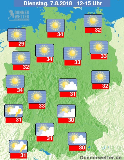 Heute Nachmittag ist es etwa nördlich des Mains verbreitet sonnig und trocken. Im Süden ziehen hingegen oft einige und zum Teil auch dichte Quellwolken auf. Im Alpenvorland und am Pfälzer Wald sind einzelne Schauer und Gewitter möglich, sonst bleibt es aber trocken. Die Temperatur liegt bei 29 Grad an der Nordsee und etwa 34 Grad im Rheinland.