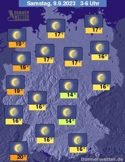 In der Nacht zum Samstag funkeln die Sterne von einem wolkenlosen Himmel, dazu bleibt es trocken. Die Temperatur sinkt auf tropische 20 Grad am Oberrhein und bis 14 Grad im Vogtland.
