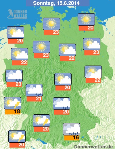 Am Sonntag bleibt es vor allem im Norden und Osten bei freundlichem, teils sonnigem Juniwetter häufig trocken. Im Südwesten sind bei wechselnder oder dichter Bewölkung örtliche Schauer und Gewitter möglich, die allerdings kein Unwetterpotenzial haben. Höchstwerte um 16 bis 23 Grad.