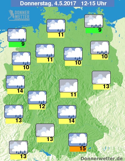Dichte Regenwolken erstrecken sich am Mittag über das gesamte Land. Zwischen den Küsten und den Alpen regnet es immer wieder, im Norden auch lang anhaltend. Zudem muss hier mit stürmischen Böen gerechnet werden. Am ehesten trocken bleibt es zwischen Thüringer Wald und Erzgebirge sowie auf der Schwäbischen Alb.
