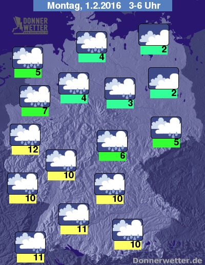 Am Montag ist der Himmel weitgehend bedeckt, im Süden zeigen sich jedoch mögliche Auflockerungen. In weiten Landesteilen fällt zeitweise, im Süden fällt gebietsweise Regen. Die Temperatur steigt auf 8 Grad am Thüringer Wald und bis 12 Grad in München. Es weht oft starker, an der Nordsee stürmischer Wind.