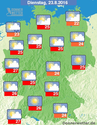 Am Dienstag ziehen vor allem vormittags im Norden noch teils dichte Wolken durch, die hier aber nur selten etwas Regen bringen können, sonst zeigt sich die Bundesrepublik verbreitet heiter oder sonnig. Teils mehr Wolken sind über der Mitte des Landes und im Südosten unterwegs, dazu bleibt es jedoch voraussichtlich trocken. Die Temperatur erreicht 22 bis 27 Grad.