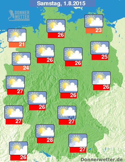 Am Samstag ist es häufig heiter bis sonnig, gebietsweise ziehen aber auch mal einige Wolken durch. Im Süden kann es hingegen auch öfter stark bewölkt sein, dabei besteht besonders am Alpenrand ein erhöhtes Schauer- und Gewitterrisiko, im übrigen Bundesgebiet bleibt es trocken. Die Temperatur steigt auf 21 Grad an der Nordseeküste und bis 28 Grad im Oberrheingraben.