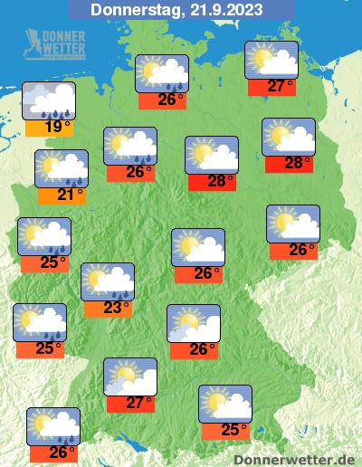 Am Donnerstag ist es über der Osthälfte Deutschlands noch meist heiter bis sonnig, hier bleibt es bis in den Abend noch trocken. Weiter nach Westen hin ziehen im Tagesverlauf mehr und mehr dichte Wolken auf und nachmittags zieht von Westen her Regen auf. Die Temperatur erreicht 19 Grad an der Nordsee und 28 Grad in der Magdeburger Börde.