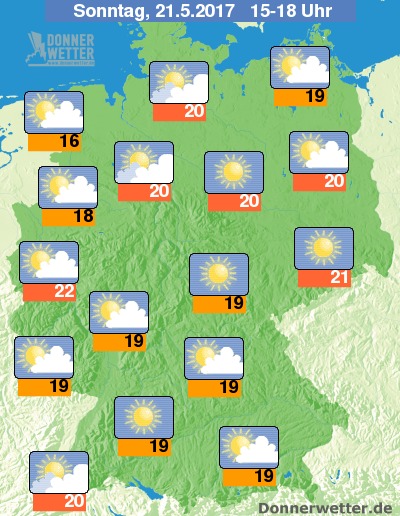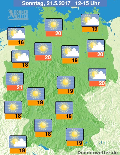 Die Tiefsttemperatur liegt am Mittag bei 16 Grad an der Nordsee. Die Höchsttemperatur liegt bei 21 Grad in Bonn.