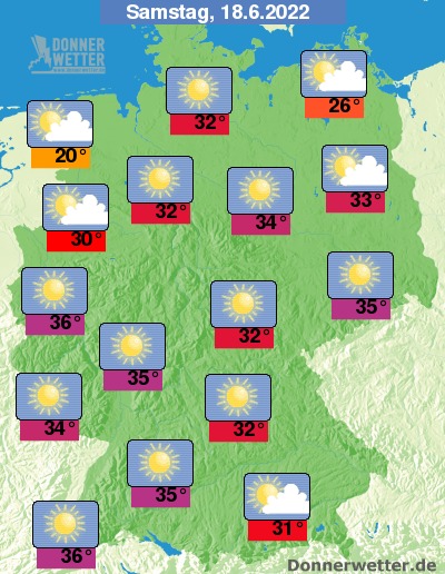 Am Samstag ist es größtenteils sonnig, vor allem im Norden und an den Alpen zieht auch lockere Bewölkung durch, dazu bleibt es zunächst überall trocken. Am Abend sind dann im Nordwesten hier und da erste Schauer und teils kräftige Gewitter möglich. Die Temperatur steigt auf angenehme 20 Grad an der Nordsee, aber bis auf drückend heiße 36 Grad im Breisgau.