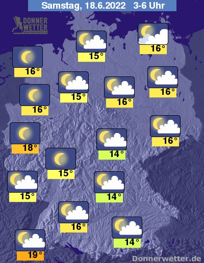 In der Nacht zum Samstag ist es anfangs vor allem über der Osthälfte noch teils stark, sonst aber schon verbreitet gering bis wechselnd bewölkt. Von Westen her klart der Himmel im weiteren Nachtverlauf immer weiter auf. Es bleibt landesweit trocken bei Tiefstwerten von 19 Grad in Freiburg und 14 Grad in Jena.