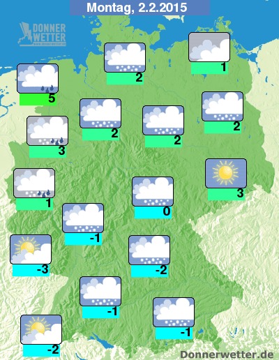 Zum Start in die neue Woche bleibt der Himmel verbreitet wolkenverhangen und es kann nur hin und wieder auch mal etwas auflockern, vor allem in Sachsen ist es dagegen auch häufig heiter bis sonnig und dazu trocken, sonst fällt hingegen vielerorts Schnee, nach Westen und Nordwesten hin auch Schneeregen oder Regen. Die Temperaturen steigen auf -3 Grad am Pfälzer Wald und bis 5 Grad an der Nordsee.