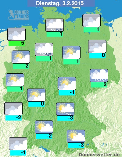 Am Dienstag ist es häufig stark, gebietsweise aber auch wechselnd bewölkt, so dass sich die Sonne auch mal zeigen kann. Es fällt hier und da etwas Schnee, nach Nordwesten hin auch Schneeregen oder Regen, die meiste Zeit bleibt es jedoch trocken. Die Temperatur steigt auf -3 Grad in München und bis 5 Grad in Emden.