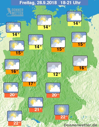 Am frühen Abend bleibt es ganz im Süden noch freundlich bei angenehmen Temperaturen von 18 bis 22 Grad. Im Norden und in der Mitte wechseln sich dichtere Wolkenfelder mit einigen Aufheiterungen ab und es sollte überwiegend trocken bleiben. Ganz im Norden lässt sich die Abendsonne noch häufiger blicken. Die Temperaturen liegen meist zwischen 12 bis 17 Grad.