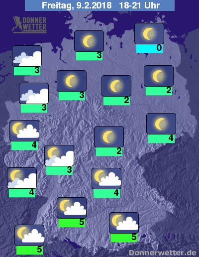 Heute Abend ist es in den westlichsten Landesteilen teils aufgelockert, teils aber auch stark bewölkt. Weiter nach Osten hin zeigt sich der Himmel hingegen überwiegend sternenklar und sonst locker bewölkt. Es bleibt landesweit trocken bei Werten zwischen 0 und 5 Grad.
