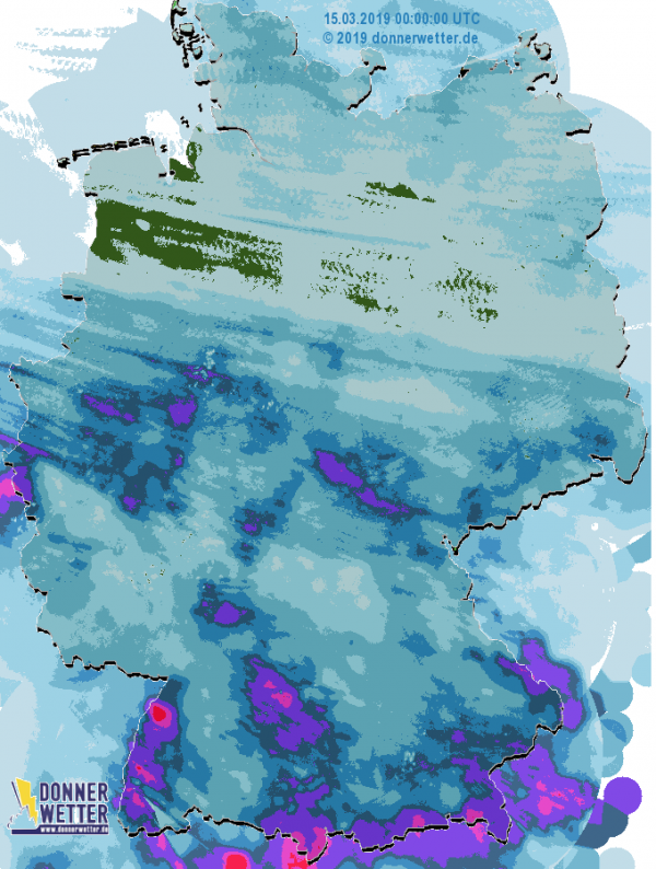 Heute ist es im Süden teils stark, gebietsweise auch aufgelockert bewölkt und es bleibt hier weitgehend trocken. Etwa nördlich des Mains halten sich den Tag über mehr oder weniger dichte Wolken und es fällt zeitweise, teils auch langanhaltend Regen. Die Temperatur steigt auf 7 Grad an der Müritz und bis 15 Grad in Berchtesgaden.