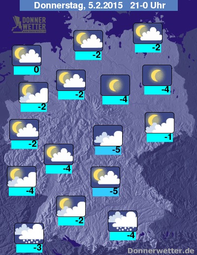 Heute Abend fällt im Nordstau der Alpen weiterhin zeitweise Schnee. In der Mitte des Landes ist es ebenfalls oft dicht bewölkt und hier und da kann etwas Schnee fallen, sonst ist es hingegen meist locker oder aufgelockert bewölkt und trocken. Verbreitet sternenklar wird es in großen Teilen von Sachsen-Anhalt und von Berlin-Brandenburg. Die Abendtemperatur liegt bei 0 Grad an der Nordsee und um -5 Grad im Coburger Land.