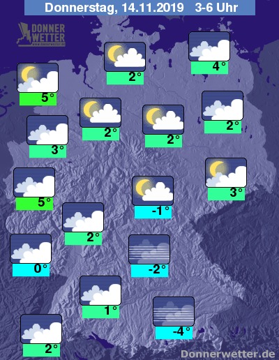 Bis zu den Frühstunden kühlt die Luft auf 0 bis 5 Grad ab. Im Süden droht gebietsweise Frost bis nahe -5 Grad und die Gefahr von überfrierender Nässe, sowie Reifglätte.