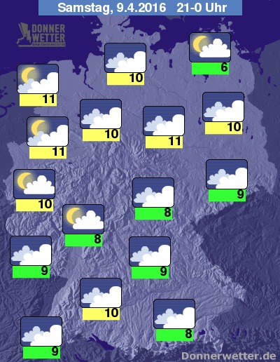 Heute Abend ist es in den westlichen Landesteilen oft nur locker oder aufgelockert bewölkt und dazu trocken. Im Süden und Osten ist es größtenteils stark bewölkt, dabei jedoch weitgehend trocken. Im übrigen Land ist es aufgelockert bis stark bewölkt und trocken. Die Abendtemperatur liegt bei 11 Grad an der Ems und um 8 Grad im Alpenvorland.