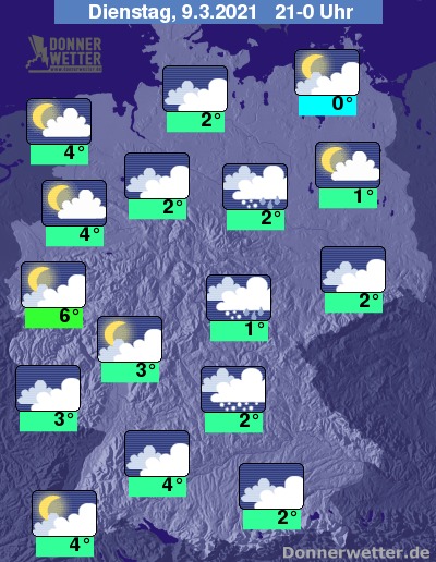 In den Abendstunden zeigt sich der Himmel vor allem im Umfeld der Küsten sowie später auch in der Westhälfte überwiegend locker oder aufgelockert bewölkt, an der Ostseeküste ist es zeitweise auch klar. In den übrigen Landesteilen bleibt die Wolkendecke zumeist geschlossen und vor allem auf einem Streifen von der Lüneburger Heide bis ins Altmühltal muss zeitweise mit Regen-, Schneeregen- oder Schneeschauern gerechnet werden.