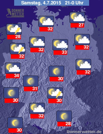 Heute Abend ist es in Deutschland verbreitet noch heiß und dazu oft drückend schwül, besonders im Norden, aber gebeistweise auch im Westen und Süden des Landes ereignen sich teils schwere Gewitter mit großem Unwetterpotential. Zumeist bleibt es jedoch sowohl über der Südhälfte Deutschlands als auch im Osten des Landes nur gering bewölkt oder auch wolkenlos und dazu trocken. Die Abendtemperatur liegt bei extrem schwülen 34 Grad in Köln und etwas frischeren 27 Grad in Rostock.