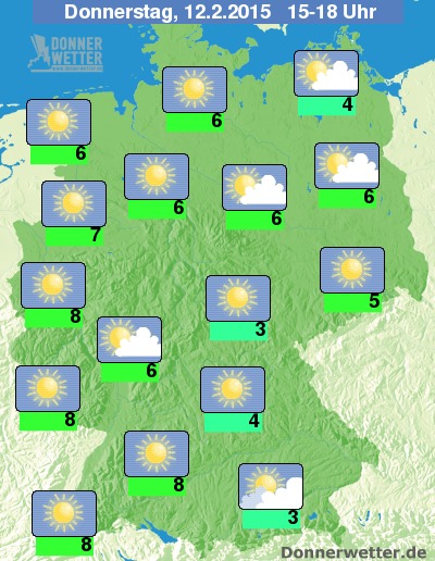 Heute Nachmittag scheint im Land verbreitet die Sonne und es ziehen zumeist nur lockere Wolkenfelder durch. Vor allem im äußersten Norden, aber auch in Teilen im Nordosten, sowie im Südosten Deutschlands bleiben die Wolken zum Teil zäh und die Sonne hat es schwer sich durchzusetzen. Es bleibt dazu überall trocken. Die Temperatur liegt bei 3 Grad im Südosten und um 8 Grad in der Kölner Bucht.