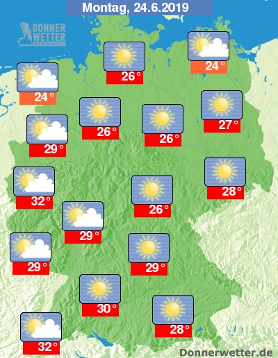 Die neue Wetterwoche startet mit weiterhin sehr freundlichem und trockenem Sommerwetter, dabei steigen die Temperaturen noch etwas an und erreichen etwa 24 Grad an den Küsten und bis 32 Grad entlang des Rheins.