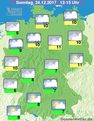 Zum Heiligen Abend fällt im Norden bei einer geschlossenen Wolkendecke zeitweise Regen. Dichte Wolken halten sich auch über der breiten Landesmitte, wobei es hier meist trocken bleibt. Im Süden ist es auch oft locker bis aufgelockert bewölkt, dazu bleibt es trocken. Die Temperatur liegt bei 7 bis 11 Grad.