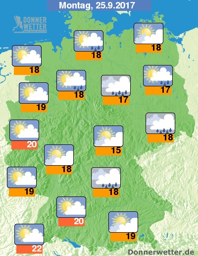 Zum Wochenstart zeigt sich das Wetter über der Nordosthälfte Deutschlands verbreitet sehr durchwachsen mit vielen und oft dichten Wolken und zeitweisen Schauern, auch Gewitter sind möglich. Freundlicher und meist trocken ist es im Westen und Süden, hier bleibt es weitgehend trocken. Die Temperatur steigt auf 15 bis 22 Grad.