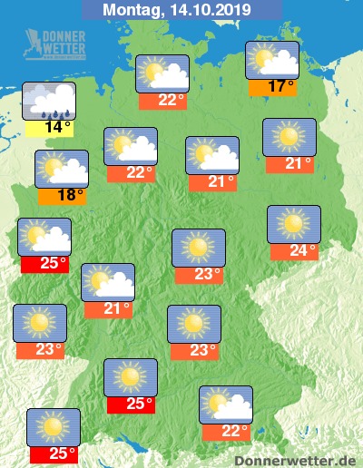Der Start in die neue Woche bietet uns verbreitet heiteres bis sonniges Spätsommerwetter. Dichte Wolken und einzelne Schauer sind dagegen im Nordwesten des Landes zu erwarten. Im übrigen Bundesgebiet bleibt es trocken bei Höchstwerten zwischen 14 Grad in Bremerhaven und bis 25 Grad vom Ober- bis zum Mittelrhein.