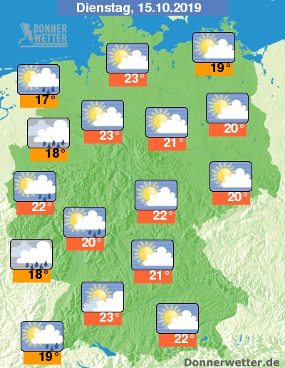Am Dienstag ist es anfangs noch größtenteils heiter bis sonnig, nur im Norden und in den westlichen Landesteilen zieht zum Teil schon starke Bewölkung durch, die aber noch keinen Regen bringt. Nachmittags werden die Wolken zuerst in den westlichen Landesteilen, bis zum Abend westlich eines Streifens vom Allgäu bis zur Nordsee immer dichter und nachfolgend bilden sich zeitweise Schauer, örtlich auch Gewitter. Die Temperatur steigt auf 17 Grad an der Nordsee und bis 23 Grad in Göttingen.