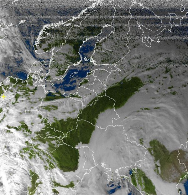 Auf dem Satellitenbildausschnitt von Osteuropa ist eine scharfe Wolkengrenze zu erkennen, die von Bulgarien, über die Ukraine bis nach Russland verläuft. Dabei handelt es sich verbreitet um nebel- oder hochnebelartige Bewölkung, die sich aufgrund der, Jahreszeit bedingt, schwachen Sonneneinstrahlung häufig den ganzen Tag über hält. Bei vorherrschendem Hochdruckeinfluss ist hierbei jedoch kein Regen zu erwarten.
