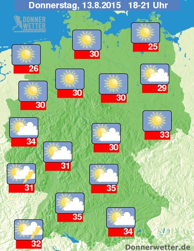 Sehr warm zeigen sich am Donnerstag die Abendstunden. Vor allem in der Nordhälfte bleibt es dabei häufig sonnig, im Süden überwiegen lockere Wolkenfelder. Am Oberrhein steigt zu Abend hin dann aber das Gewitterrisiko. Die Temperaturen erreichen Werte um 25 Grad C an der Ostseeküste und um 35 Grad C in Stuttgart.