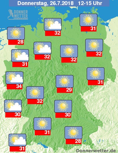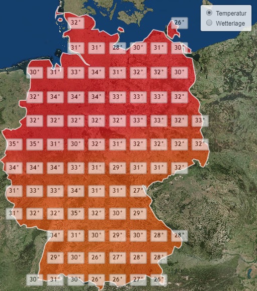 Dazu steigen die Temperaturen am Nachmittag erneut fast landesweit auf Werte über der 30 Grad Marke. Nur im Südosten des Landes und an der Ostsee bleibt es einige Grad kühler. Am wärmsten wird es heute mit Höchstwerte um die 35 Grad voraussichtlich am Niederrhein und im Rhein-Main-Gebiet.