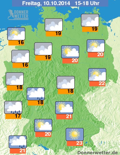 Heute Nachmittag bilden sich bei vielfach dichten Wolken vom Schwarzwald bis hin zum Saarland und ins nördliche Baden-Württemberg hinein gebietsweise Schauer und einzelne Gewitter, sonst ist es im Süden vielfach heiter oder aufgelockert bewölkt und trocken. In den übrigen Landesteilen ist es teils aufgelockert, häufig aber auch stark bewölkt, dabei bleibt es jedoch weitgehend trocken. Die Temperatur liegt bei 16 Grad an der Ems und etwa 23 Grad in Oberbayern.