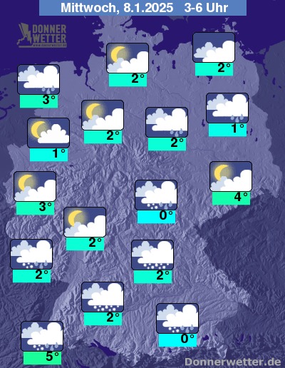 In der Nacht zum Mittwoch sind in der Nordhälfte noch einzelne Schneeregen- oder Schneeschauer möglich, im weiteren Verlauf nachlassend. Südlich des Mains kommen in den frühen Morgenstunden neue Regen- oder Schneefälle auf, lokal besteht Glättegefahr!