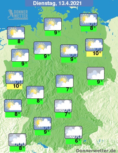 Am Dienstag ist es im Süden überwiegend stark bewölkt, dabei bilden sich zeitweise Schnee- oder Regenschauer. Im übrigen Bundesgebiet ist es teils heiter, zum Teil ist es stark bewölkt, dazu bilden sich einzelne Schnee- oder Regenschauer. Die Temperatur erreicht etwa 6 Grad in München und bis 10 Grad in Köln.