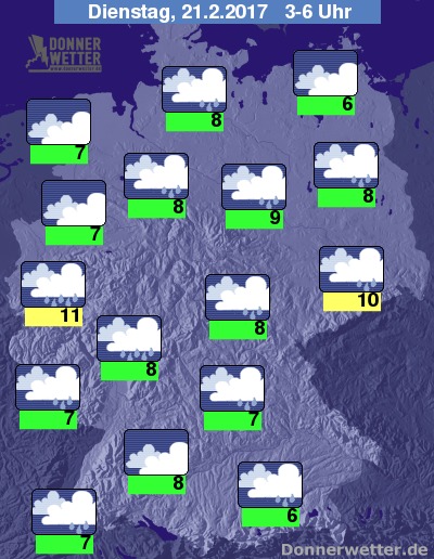 In der Nacht zum Dienstag bleibt es bei den dichten Wolken und es fällt mit Ausnahme des Küstenumfelds von Nord- und Ostsee immer wieder Regen. Im weiteren Verlauf bleibt es im Norden überwiegend trocken. Die Nachttemperatur liegt bei 11 Grad in Köln und etwa 6 Grad in Rostock.