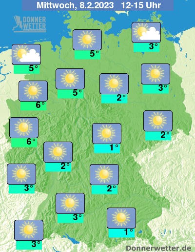 Die Temperaturen erreichen am Nachmittag Höchstwerte um 2 Grad in Franken, 5 Grad an der Weser und 7 Grad im Rheinland.