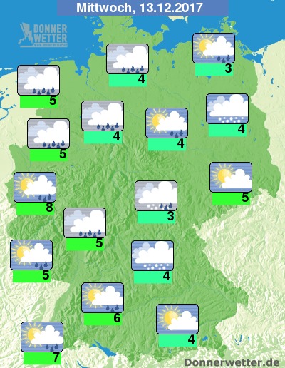 Im Laufe des Vormittags setzt mit kräftig auffrischendem Südwestwind im Westen und Nordwesten Niederschlag ein, dieser kann anfangs in höheren Lagen als Schnee fallen. Sonst bleibt es bei einer Mischung aus kurzen freundlichen Phasen und dichterer Bewölkung zunächst trocken. Am Abend erfasst der Niederschlag auch die Oder und Bayern, dabei fällt zunächst Schnee, später in tieferen Lagen Regen. Die Temperaturen klettern im Tagesverlauf auf 1 bis 7 Grad. Der häufig starke Südwestwind verstärkt den ungemütlichen Charakter noch. In der Nacht auf Donnerstag erreicht uns dann die frischere Luft und aus den Tropfen werden teilweise wieder Flocken.