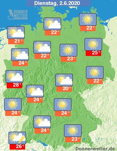 Am Dienstag ist das Wetter mehrheitlich heiter bis sonnig, gebietsweise ziehen allerdings auch einige Wolken durch, es bleibt aber weitgehend trocken. Die Temperatur erreicht 20 Grad im Eichsfeld und bis zu 28 Grad in Bonn.