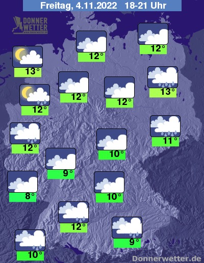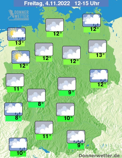 Heute Nachmittag hält sich über der Bundesrepublik verbreitet dichte Bewölkung und nur ganz selten zeigen sich mal Auflockerungen, am ehesten noch vom Niederrhein bis zur Nordsee. Vereinzelt bilden sich Schauer. Im Süden und Osten fällt gebietsweise Regen . Die Temperatur liegt bei 8 Grad am Westerwald und bis 13 Grad in Berlin.