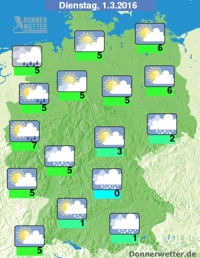 Heute bleibt es im Süden und in Sachsen verbreitet bedeckt und es fällt häufig Schnee. Im übrigen Bundesgebiet ist es zum Teil heiter, teils ziehen auch einige Wolken durch, dazu bleibt es zunächst trocken, gegen Abend zieht im Westen und Nordwesten jedoch Regen auf. Die Temperatur steigt auf 0 Grad in Mittelfranken und bis 7 Grad in Bonn.