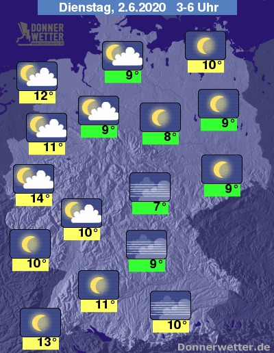 In der Nacht zum Dienstag bleibt es über der Südosthälfte Deutschlands sternenklar, dagegen sind vom Westen, über den Nordwesten bis in den Norden auch einige Wolken möglich, dazu bleibt es trocken. Die Temperatur sinkt auf 14 Grad in der Kölner Bucht und bis 7 Grad im Vogtland.