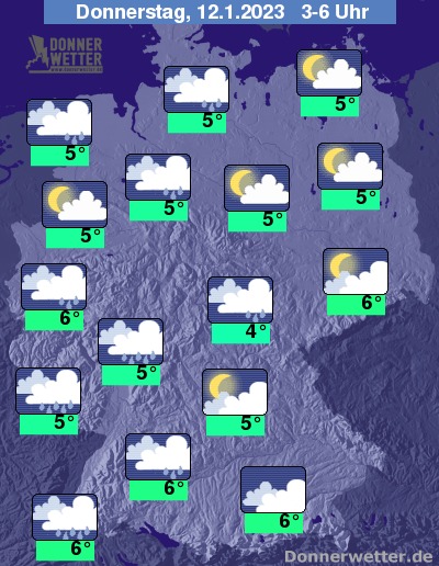 Am Donnerstag zeigt sich das Wetter stark bewölkt oder bedeckt, im Osten ist es zum Teil auch locker bewölkt. Es fällt zunächst nur selten Regen, ab den Mittagsstunden zieht allerdings von Westen her neuer Regen auf. Die Temperatur steigt auf 6 Grad in Mittelfranken und bis zu 11 Grad in der Kölner Bucht. An den Küsten ist es teilweise stürmisch.