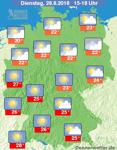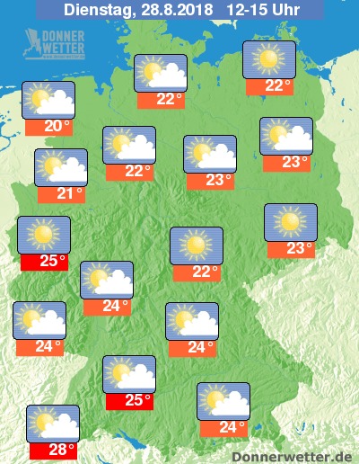 Im Laufe des Nachmittags und frühen Abends lösen sich die Wolken immer weiter auf, während sie sich im Norden mit der Sonne das Regiment am Himmel teilen. Die Temperaturen klettern vor allem in der Südwesthälfte verbreitet in den sommerlichen Bereich von über 25 Grad.